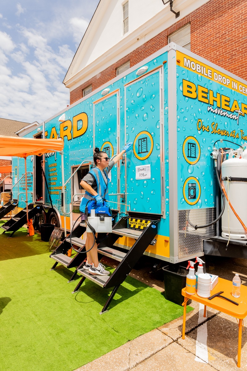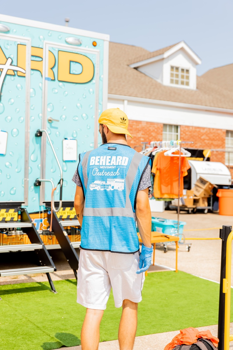 Serving in person with BeHeard can look like helping operate our mobile showers, assisting with laundry, supporting the clothing trailer, organizing donations and inventory, serving meals, providing haircuts, leading activities, or simply spending time building community with our guests.